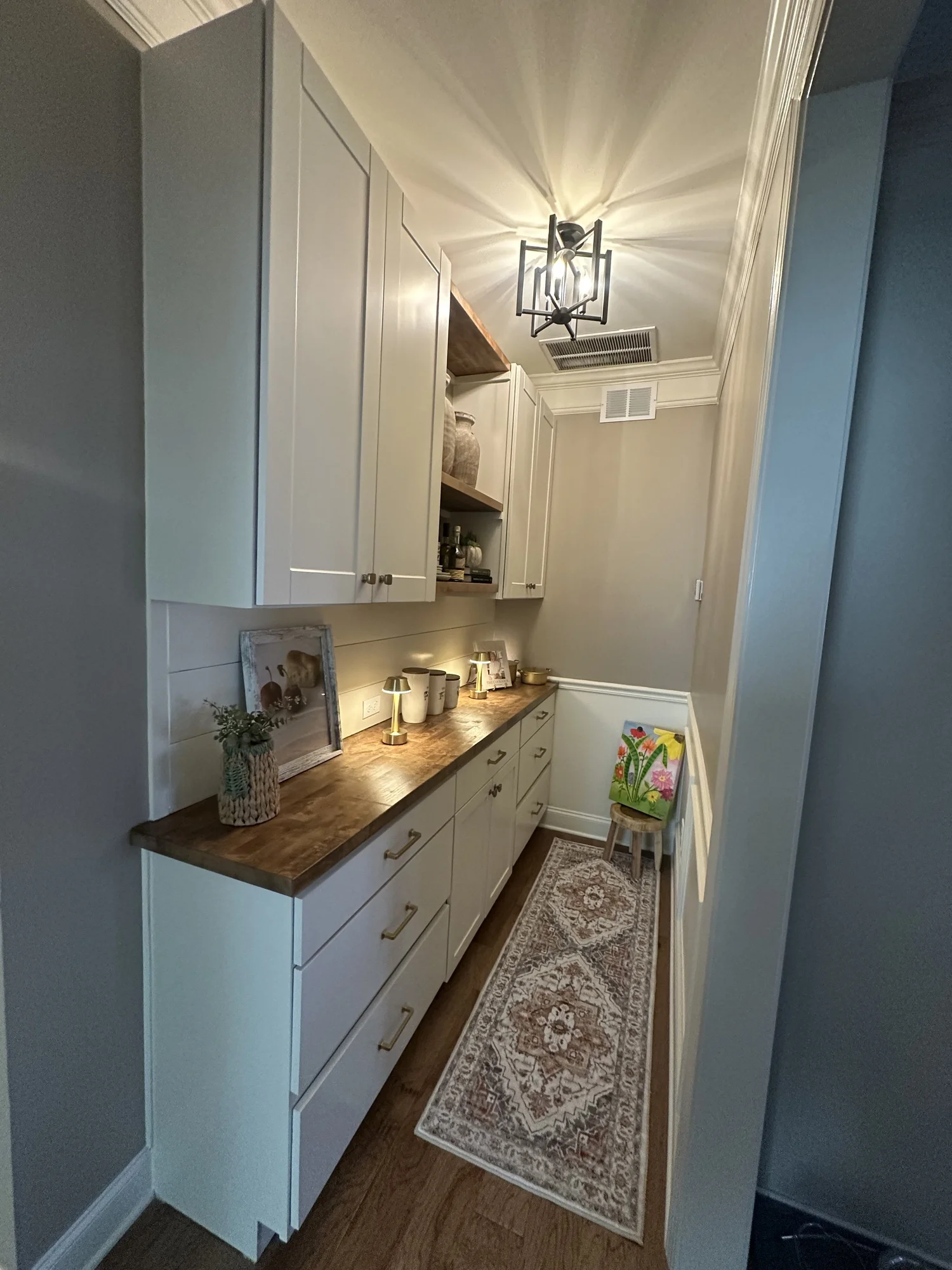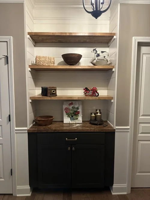 Custom cabinets, butcher block and floating shelfs